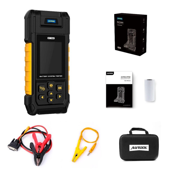 AUTOOL BT960 — современный тестер аккумуляторов с встроенным датчиком температуры, термопринтером, мониторингом утечек и поддержкой тестирования литиевых батарей. Это многофункциональный инструмент, подходящий для диагностики 12В и 24В систем, обеспечивая точные и оперативные результаты.