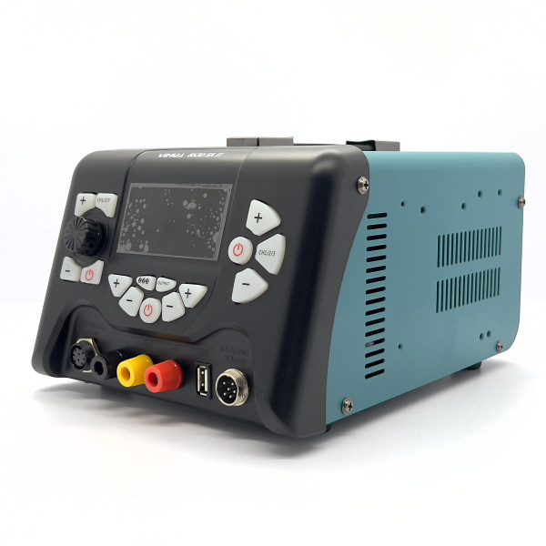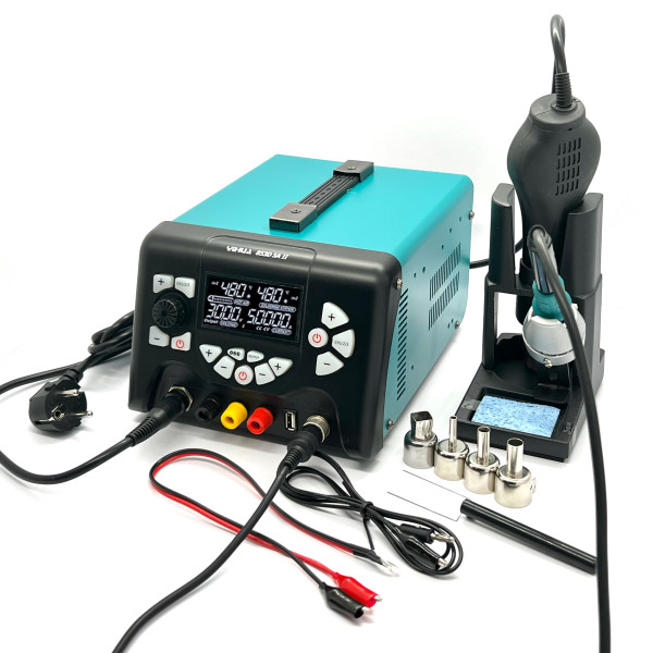 YIHUA 853D 5A-II — це сучасна універсальна паяльна станція, що поєднує термофен, паяльник і лабораторне джерело живлення 0–30 В / 0–5 А. Завдяки потужності, стабільності нагріву й зручному цифровому керуванню ця модель ідеально підходить для ремонтних робіт з електронікою, автомобільними блоками, SMD/BGA-компонентами, ноутбуками, смартфонами й мікроконтролерами.