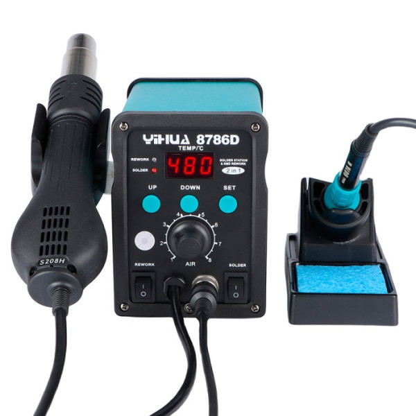 YIHUA 8786D — це комбінована паяльна станція, яка об’єднує фен гарячого повітря та паяльник у єдиному корпусі. Пристрій призначений для монтажу, демонтажу та ремонту різних типів електронних компонентів, включно з мікросхемами SMD, BGA, QFP та елементами автоелектроніки.
